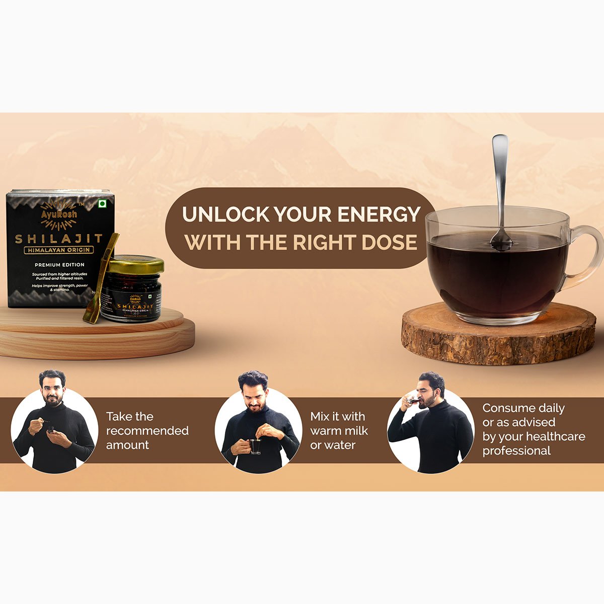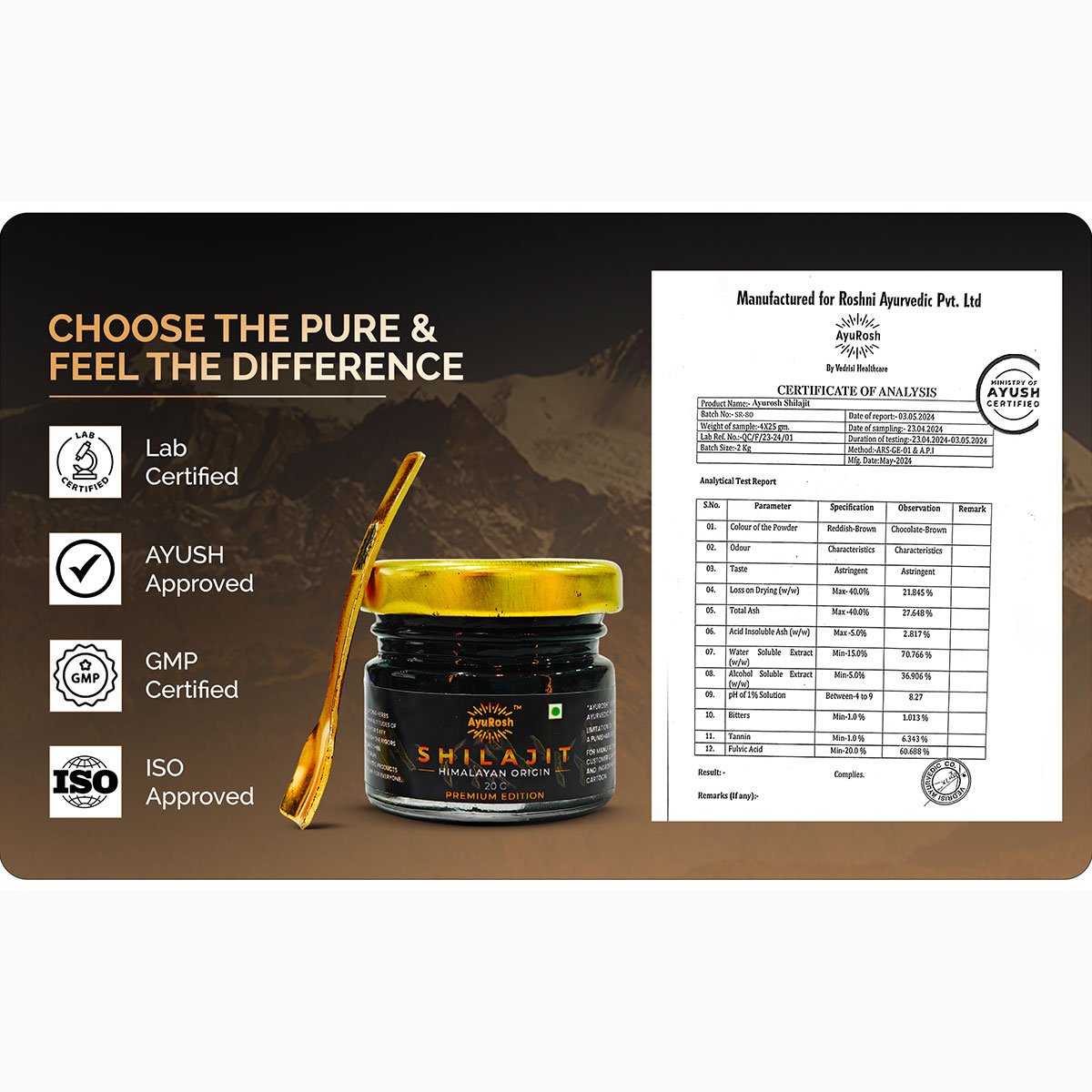 Harness the pure power of the Himalayas with AyuRosh Shilajit Premium Edition, ethically sourced from high-altitude regions above 18,000 ft, including Altai, Annapurna, and Gilgit. This authentic Shilajit resin is carefully purified and lab-tested to retain its natural bioactive compounds, making it a potent supplement for energy, vitality, and overall wellness.