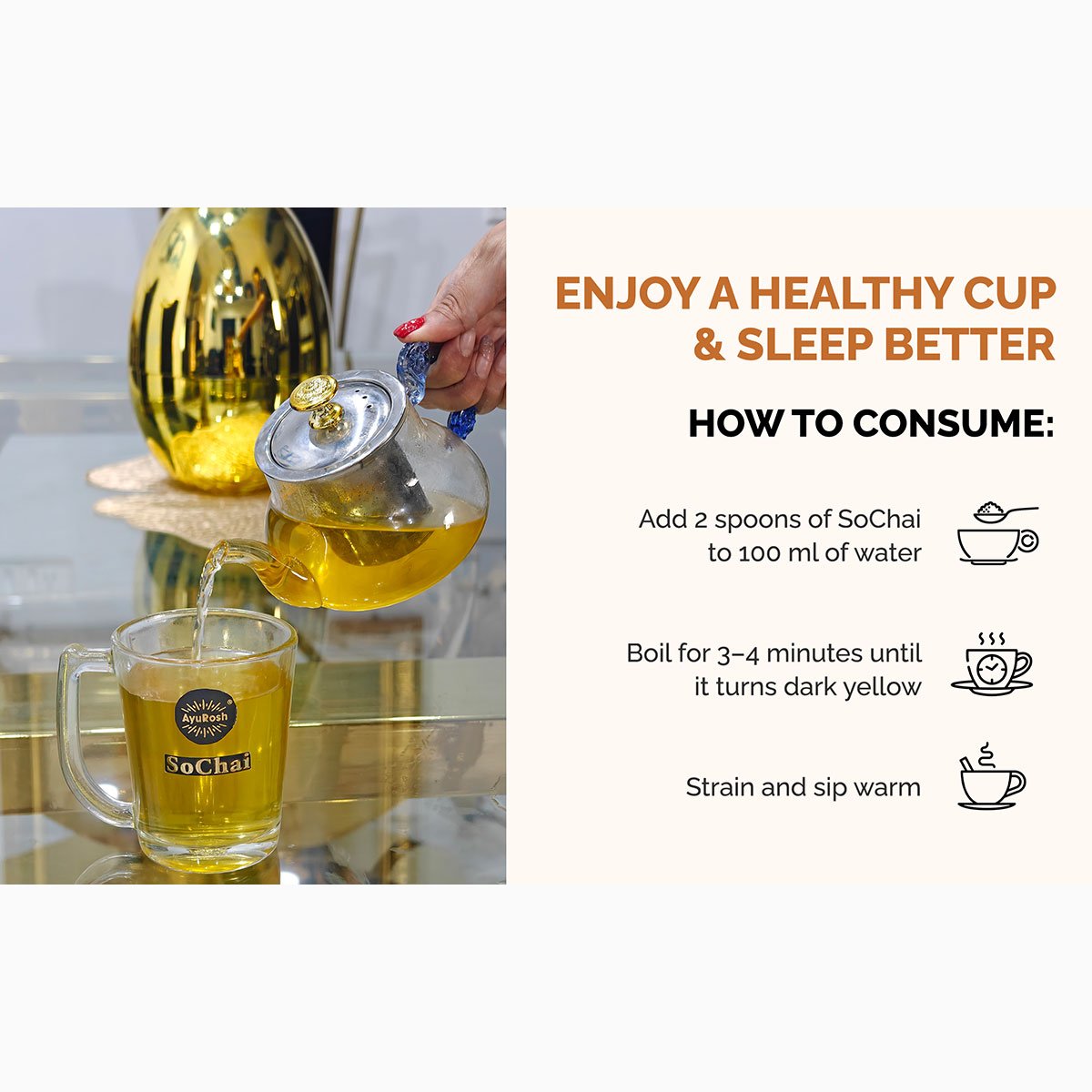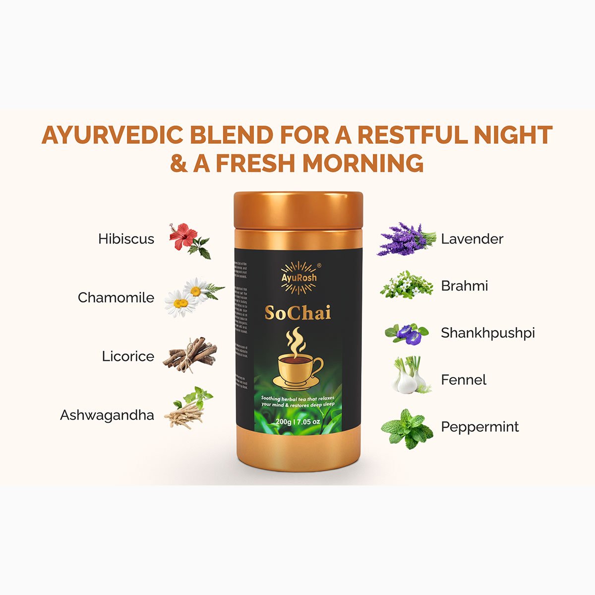 Relax, unwind, and enjoy a healthier, calmer sleep with AyuRosh SoChai Sleep Like A Queen Herbal Tea – a perfect blend for your mind, body, and spirit.